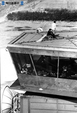 ゲリラに占拠され、救出を待つ成田の管制官。500人の過激派が空港に乱入、うち6人が管制塔に侵入、2時間半にわたって占拠した=1978年3月26日撮影