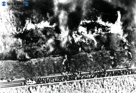 放火された敷地の枯れ草とデモ隊。3月30日開港に致命的な打撃を受けた政府は開港を大幅に延期、過激派の厳重取り締まりを指示した=1978年3月26日撮影