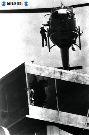3月30日の成田空港開港予定前の26日、過激派のゲリラが蜂起。中央管制塔に突入、6人の管制官はヘリで救出された=1978年3月26日撮影